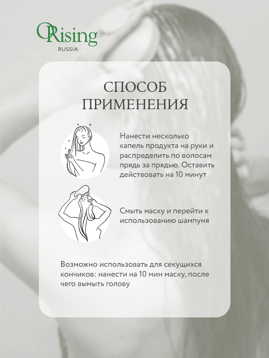 - Распределить равномерно по всей длине после использования шампуня ArgORising и Флюида «Идеальные волосы».
